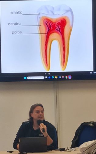 La lezione è stata tenuta dal dott. Eraldo Ciangherotti, odontoiatra, che ha guidato i bambini in un vero e proprio viaggio alla scoperta della bocca come “centro di comando” di molte funzioni vitali. Attraverso un linguaggio semplice e coinvolgente, ha spiegato che la bocca non serve solo a mangiare, ma è una vera e propria porta di ingresso per la salute: permette la masticazione, la deglutizione, la respirazione, la fonazione e rappresenta un importante punto di partenza per il benessere generale.