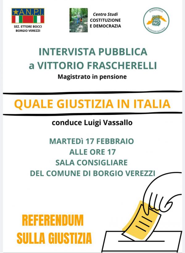L’evento è promosso dalla locale sezione Anpi, dal Centro Studi Costituzione e Democrazia e dal comitato ‘Giusto dire No‘. Il moderatore sarà il prof. Luigi Vassallo già dirigente scolastico. A rispondere alle domande il dott. Vittorio Frascherelli che è stato presidente di sezione del Tribunale di Savona e presidente vicario del Tribunale di Genova.