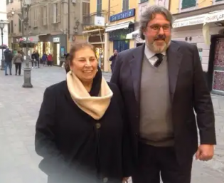 Alassio: Giulia De Medici Almirante, figlia del compianto Giorgio Almirante, storico segretario del Msi con Angelo Vaccarezza mentre raggiungono una cerimonia nello storico Caffè Balzola
