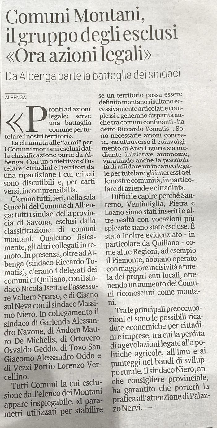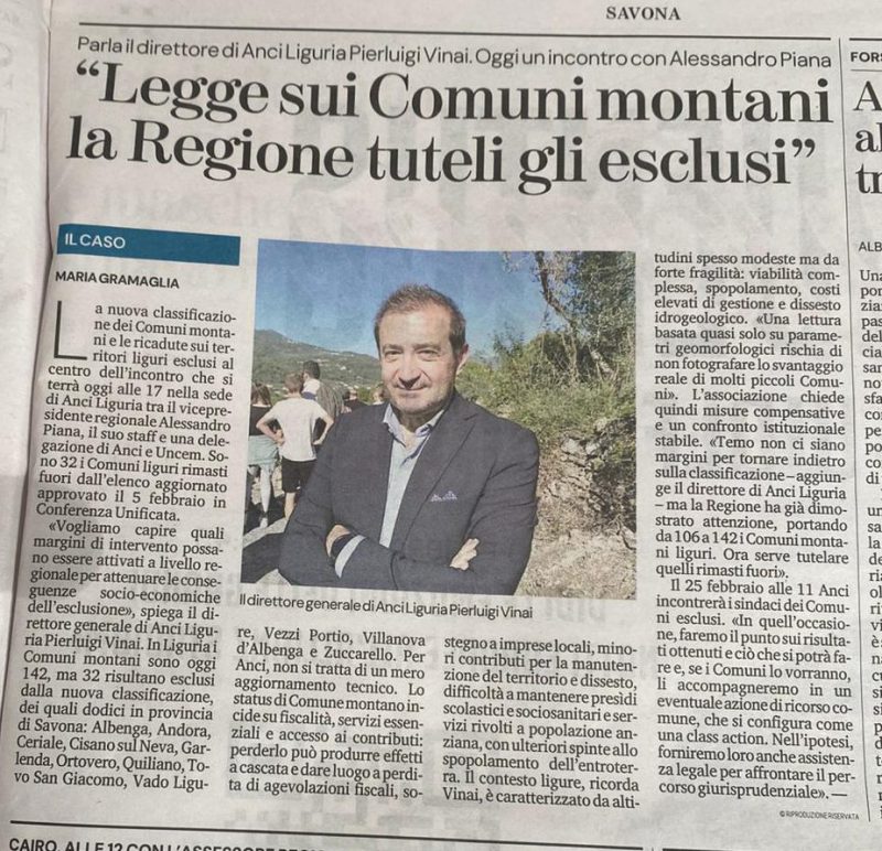 Mi riferisco all’articolo pubblicato su La Stampa, pagine savonesi, lunedì 15 febbraio, a firma di Maria Gramaglia, dal titolo “Legge sui Comuni montani la Regione tuteli gli esclusi”, che ha riportato all’attenzione pubblica una questione delicata e dalle conseguenze non trascurabili.
