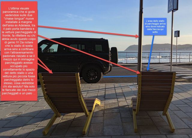 Come potrete apprezzare dalla foto a corredo allegata, c’è solo un piccolo problema proprio davanti alle due sedute: un bel palo portabandiera di robusto diametro, ma peggio proprio lì di fronte inizia la corsia con gli stalli di parcheggio “blu” (a pagamento) parallela alla strada, quindi se ci parcheggia qualcuno, e la cosa è certa sia fuori stagione ma sicuramente inconfutabile che avvenga nella bella stagione con l’arrivo di tanti turisti, il panorama da ammirare diventano le fiancate dei veicoli lì in sosta.