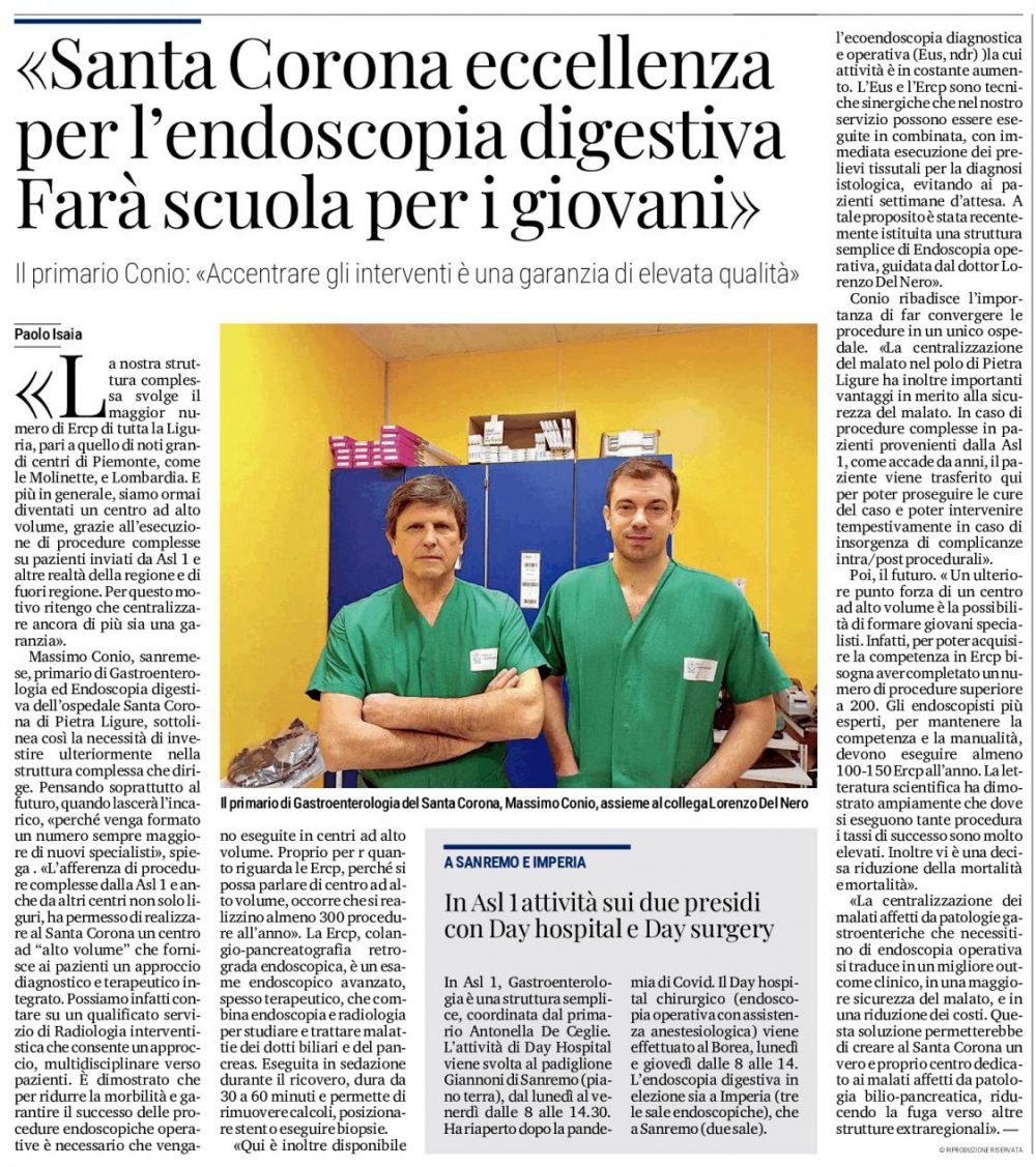 IL SECOLO XIX EDIZIONE IMPERIA-SANREMO ha pubblicato un’interessante informazione su un reparto d’eccellenza per l’endoscopia digestiva, forse poco promozionato, del Santa Corona. Non è un caso di baronia di camici bianchi. E’ un servizio a cui possono accedere ricchi e poveri. E’ quella medicina di qualità che non dovrebbe essere un’eccezione anche negli ospedali della nostra Liguria. Un approccio diagnostico terapeutico integrato, multidisciplinare verso i pazienti. L’ecoendoscopia diagnostica e operativa è in costante aumento e al Santa Corona c’è il volume di lavoro superiore ben oltre a 300 procedure all’anno.  Le tecniche sinergiche eseguite in combinata, con immediata esecuzione  dei prelievi tessutali per la diagnosi istologica, evitano ai pazienti settimane di attesa. I tassi di successo sono molto elevati anche per procedure complesse con una decisa riduzione della mortalità. Si aggiunga che il ‘centro alto volume’ da la possibilità di formare giovani specialisti.