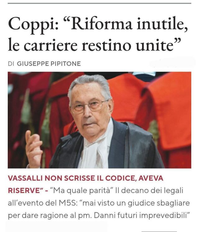 3/L’AVVOCATO COPPI- E uno dei più noti penalisti italiani, celebre per aver difeso figure di primo piano della politica e noti casi di cronaca, tra cui Silvio Berlusconi (nei processi Mediaset e Ruby), Giulio Andreotti (processo Pecorelli), Sabrina Misseri, Antonio Fazio, Gianni De Gennaro e Vittorio Emanuele di Savoia. I suoi migliori clienti sono stati esponenti politici della destra.”Ho passato tutta la vita nei tribunali e posso dire tranquillamente che è una gabbia di matti». Con altri processi a carico di Andreotti e Berlusconi, per mafia, lanciò anche una sua giovane collaboratrice di studio, oggi presidente della commissione Giustizia al Senato, Giulia Bongiorno eletta con la Lega di Salvini Premier.