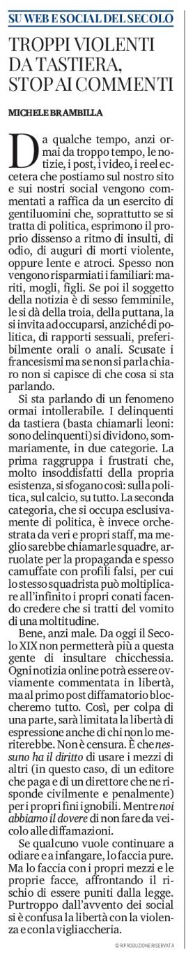 Il direttore del Secolo XIX: Delinquenti da tastiera stop ai commenti. 2 / Il giurista internazionale: Contro Albanese e Gratteri manipolazioni di chi si affida alla falsità. C’è il presidente La Russa
