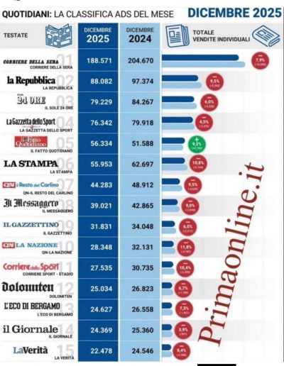 Nell’ultima classifica Ads, pubblicata da Primaonline, sulla diffusione dei quotidiani italiani Il Fatto Quotidiano mostra la performance migliore in assoluto. I dati di dicembre 2025 confrontati con dicembre 2024 segnano più 9,2 per cento, passando da 53.098 copie giornaliere diffuse (edicola più digitale) a 57.983. Al secondo posto, molto distanziato, c’è Avvenire (più 1,8 per cento), al terzo la Repubblica (più 0,9 per cento).