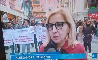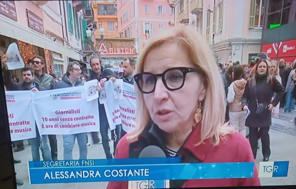 Anche l’Associazione Ligure dei Giornalisti e l’Ordine dei Giornalisti della Liguria hanno partecipato al flash mob organizzato dalla Fnsi per il rinnovo del contratto. «Il contratto fermo al 2014, i minimi contrattuali fermi al 2012. Noi stiamo facendo questa protesta che è una protesta economica per il rilancio della professione, dell’informazione. Abbiamo la necessità di rinnovare il contratto, di rinnovarlo sia per la parte economica sia per la parte normativa. Oggi c’è l’intelligenza artificiale ma il nostro contratto non ne parla e questo non va bene. E questo per quanto riguarda i dipendenti. Poi abbiamo i giornalisti autonomi, freelance, collaboratori coordinati e continuativi che vivono con stipendi da fame. Un CoCoCo guadagna circa 11.000 euro lordi all’anno, una partita Iva 17.000 euro all’anno. La qualità dell’informazione così non ci può essere, ma senza qualità l’informazione muore. Senza qualità l’informazione è destinata a diventare il regno del Copia e Incolla e questo non lo vogliamo», ha detto Alessandra Costante, segretaria generale della Fnsi che ha portato a Sanremo, nel giorno dell’apertura del Festival il 24 febbraio 2026, la