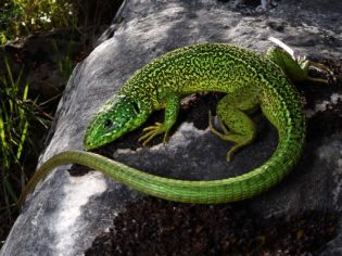 Il ramarro corre sui rovi con un guizzo giallo e verde.