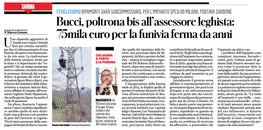 Un articolo di Marco Grasso sulle pagine de il Fatto Quotidiano rivela che il presidente, ex manger Bucci, ha assegnato all’assessore savonese Paolo Ripamonti il ruolo di sub commissario delle Funivie di Savona dopo 8 anni di stasi. In realtà sono 75 mila Euro che si aggiungono a 13.764,00 lordi mensili per un totale di 165.168,00 lordi annui. Sommati fanno 240 mila euro. Quale è la quota mensile destinata al partito?