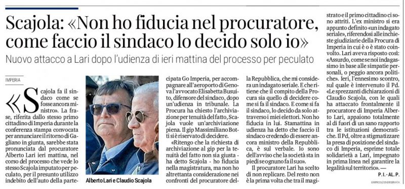 “Il compito istituzione del Procuratore della Repubblica non è quello di decidere come si fa il sindaco”. Mentre è in attesa di un nuovo processo. Quello che ha scatenato l’ira del sindaco-presidente della Provincia Scajola è la storia dell’uso dell’auto blu messa a disposizione del legale di fiducia con studio professionale a Roma.