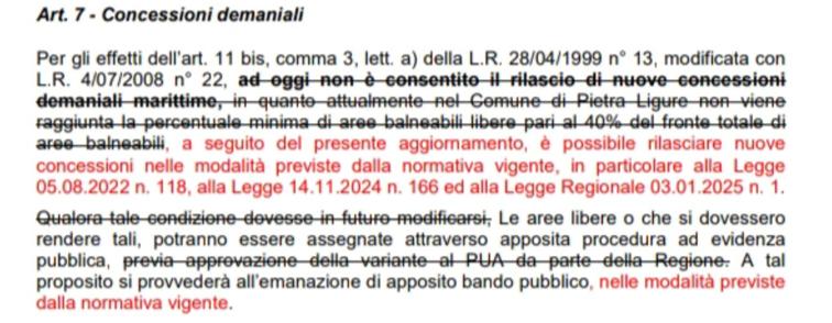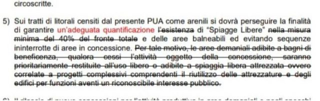 Inoltre, nel n⁰5 dello stesso art.7 del PUD, mentre prima era scritto, testualmente: “Sui tratti di litorale censiti dal presente PUD come arenili, si dovrà perseguire la finalità di garantire l’esistenza di “Spiagge libere” nella misura minima del 40% del fronte totale