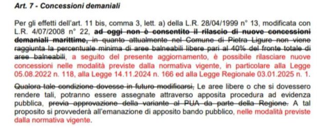 Per gli effetti dell’art. 11 bis, comma 3, lett. a) della L.R. 28/04/1999 n° 13, modificata con L.R. 4/07/2008 n° 22, ad oggi non è consentito il rilascio di nuove concessioni demaniali marittime, in quanto attualmente nel Comune di Pietra Ligure NON