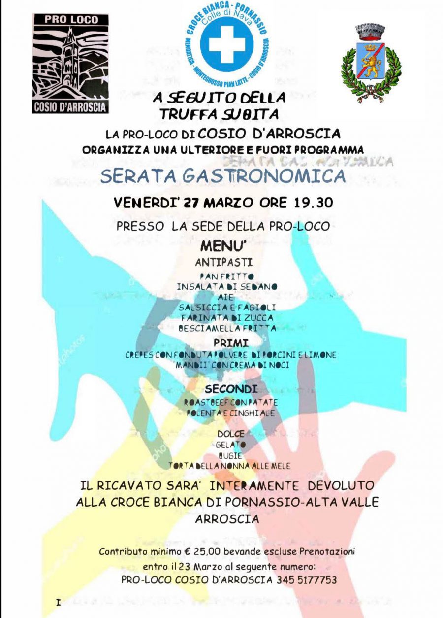 Pornassio, opera di bene del Comune: 5 mila € alla Croce Bianca. Pro Loco di Cosio d’Arroscia: “Dopo la truffa subita… serata gastronomica”