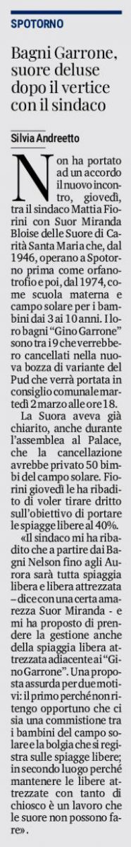 Si dirà: ormai non possiamo tornare indietro, oppure niente ‘figli e figliastri’. Anche per i titolari di Bagni l’appello (i bambini non sono numeri) un’eccezione è ‘irricevibile’? E da parte delle suore un ‘impegno scritto‘ a non cedere la concessione e sfruttarla a mero scopo di lucro, tenendo conto che le spese ci sono.
