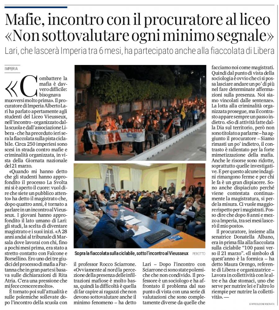 La lotta alla criminalità organizzata prosegue, ma il contrasto appare sempre un passo indietro. «So di attività fatte dalla Dia sul territorio, però non sono titolato a parlarne – ha aggiunto il procuratore – Siamo rimasti un po’ indietro, il contrasto è rallentato per la forte mimetizzazione della mafia. Anche le risorse sono ridotte, soprattutto quelle investigative. E per questo alcune indagini rimangono ferme e per chi le fa è un gran dispiacere. Sono anche dispiaciuto perché viene contestata continuamente la magistratura, si perde la misura. Ci vuole maggiore rispetto per i magistrati. Posso dire che dopo 8 anni e mezzo a Imperia, tra sei mesi lascerò il mio posto».