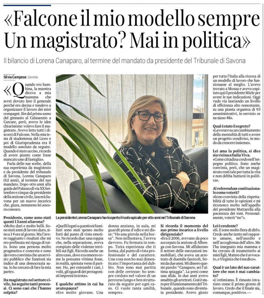 Capo dott. Ubaldo Pelosi (il suo voto è Nò) e dell’ex sostituto procuratore della Repubblica dott. Alberto Landolfi (il suo voto è Sì. Tra gli interventi, in occasione di incontri pubblici, la tesi dell’ex presidente del Tribunale di Savona (sezione penale) e poi presidente vicario del Tribunale di Genova, dott. Vittorio Frascherelli (il suo voto va al Nò), l’ex Procuratore Capo dott. Vincenzo Scalastico (il suo voto è ‘Sì), l’ex Procuratore Maurizio Picozzi (il suo voto è Nò). Non restava che ripubblicare l’intervista al Decimonono, della dott.ssa Lorena Canaparo, che ci accinge a lasciare il suo incarico di presidente del Tribunale con una ‘pagella’ senza precedenti nella storia giudiziaria di Savona. Con la sua squadra, con il presidente della sezione civile dott. Alberto Princiotta, nonostante le perduranti carenze di organici, nelle ultimi tre anni, ha raggiunto il primato nazionale di minori cause civili arretrate. E chi ha seguito le vissuto le statistiche del Tribunale di Savona, dagli anni ’60, ricorderà i titoli dei quotidiani locali. Davano notizie di ispezioni ministeriali e procedimenti disciplinari per il numero di cause arretrare, anche oltre il decennio. Pure allora c’erano carenze in organico di giudici e personale amministrativo. Al punto che scherzando si diceva: meglio lasciare l’arretrato, altrimenti riducono ulteriormente la già carente forza in campo. Nell’intervista a Silvia Campese la presidente Canaparo usa toni pacati a proposito del referendum: “Sono convinta della rispettabilità di tutte le opinioni e mi riconoscono molto nell’appello del presidente Mattarella alla pacatezza dei toni, personalmente voterò Nò.” La dott.ssa Fiorenza Giorgi, per anni in prima linea nel ruolo di giudice a Savona, ha partecipato ad eventi a sostegno del ‘No’.