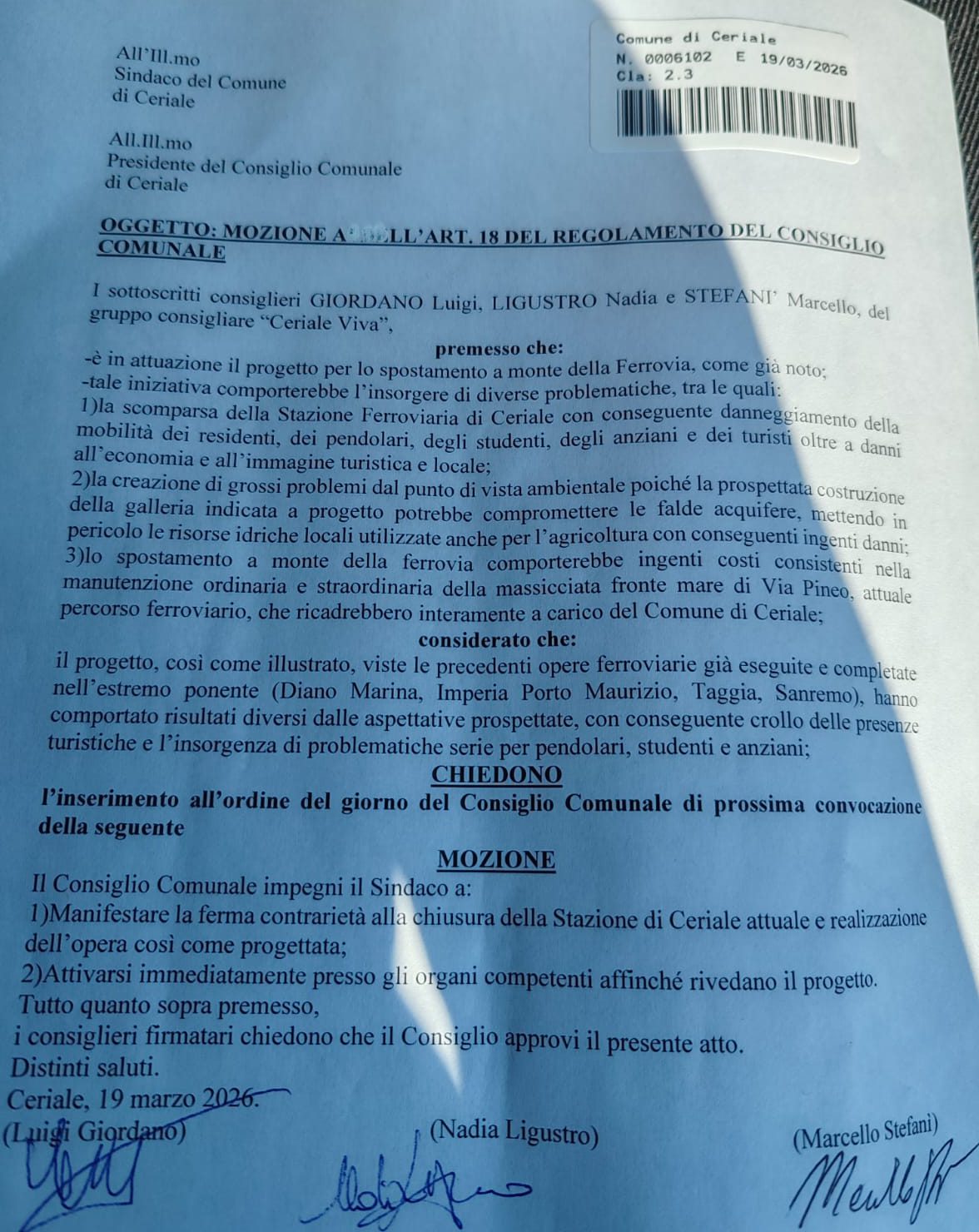 MOZIONE CONSILIARE CHE SARA’ POSTA IN VOTAZIONE –