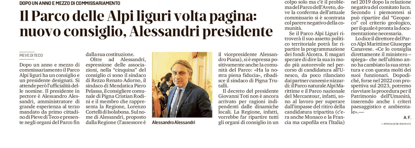2/Alessandro Alessandri è stato nominato presidente del Parco Naturale Regionale delle Alpi Liguri nel luglio 2021. La nomina è avvenuta tramite decreto del presidente della Regione Liguria, Giovanni Toti, nell’ambito di un rinnovo dei consigli dei parchi regionali per promuovere lo sviluppo sostenibile del territorio.