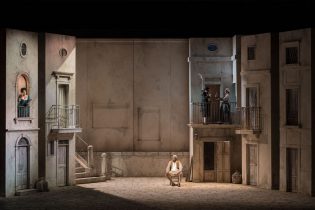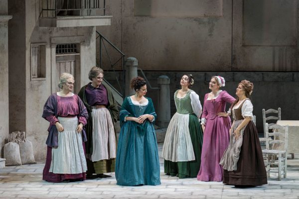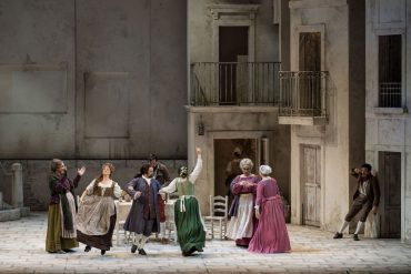 Non manca di amaro realismo, insomma, la regia che Federico Bertolani ha escogitato per l’allestimento (proveniente dalla Fondazione Arena di Verona) del Campiello di Ermanno Wolf-Ferrari, andato in scena per tre sole rappresentazioni al teatro Carlo Felice. Alla scenografia e ai costumi rigorosamente settecenteschi e di gradevole impatto visivo, immaginati da Giulio Magnetto e Manuel Pedretti, faceva da controcanto, sullo sfondo della piazzetta, il susseguirsi di mimi che incarnavano, di volta in volta, i volti di una Venezia dove il tempo scorre veloce e inesorabile e dove le antiche maschere di Arlecchino e Colombina – l’opera è ambientata durante il carnevale – cedono il posto prima ad altolocati turisti ottocenteschi in gondola e poi a volgari crocieristi sbarcati da una meganave MSC. Se già ai tempi di Wolf-Ferrari il campiello non era più quello narrato da Goldoni ma poteva ancora assomigliargli per alcuni aspetti, ai giorni nostri negli stessi luoghi restano solo B&B e case-vacanza a servizio dell’industria turistica di massa.