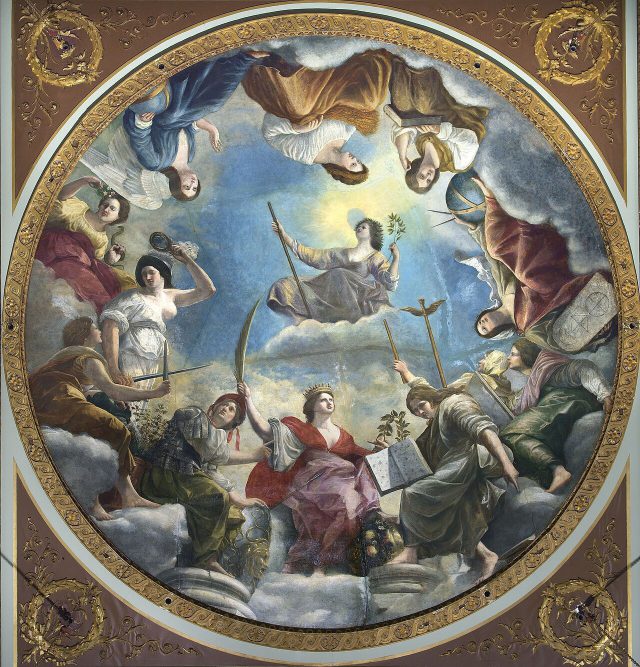 Legato a Raffaello ma pienamente intriso di spirito seicentesco, egli trova nella calibrata volatilità della forma, quella forma sperimentata in lungo e in largo dai grandi maestri del XVI secolo e replicata fino alla noia dalla Maniera, la manifestazione più moderna per l’epoca. Proattivamente, apre quella via dinamica che porta fino a P. P. Rubens senza soluzione di continuità, passando per Guido Reni e Guercino. Perché è proprio Rubens la vetta del Barocco in pittura, e Orazio lo conosce a Genova, dove lavora prima di prendere la strada della Francia e di Londra. Ed è nella capitale inglese che la figlia Artemisia lo raggiungerà, in un atto supremo di perdono per le ingiustizie di cui la storia incolpa il padre (il caso della violenza su di lei dell’importante esperto di pittura di paesaggi Agostino Tassi) e, a braccetto con la sua morte, lavora con lui all’ultima opera, “Allegoria della pace“. Chiamato anche “Pace sorretta dalle arti”, si tratta di un imponente olio su tela destinato a un nobile soffitto che sarà completato grazie ad Artemisia con Orazio ancora in vita. Curioso vedere quest’opera imponente oggi, con i venti di guerra che soffiano da tutte le parti, e leggerne i contenuti di 400 anni fa, come quelli di oggi: l’amore di una figlia per il padre, il perdono, e le arti contro la guerra… C’è una grande lezione del femminile in questo caso artistico, incluso il rifiuto della violenza che le arti rappresentano.