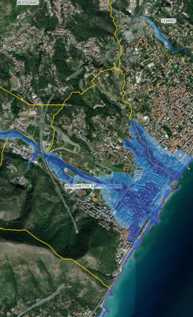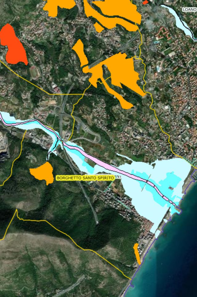 Nelle immagini le aree ad elevato rischio idrogeologico e alluvionale nel Comune di Borghetto Santo Spirito (fonti geoportale Regione Liguria).