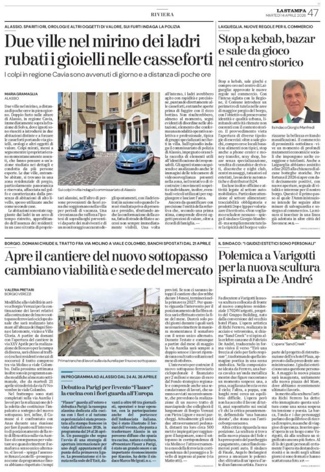 E se i quotidiani cartacei con cronaca locale, se i quotidiani on line savonesi, volano alto e non fanno nomi, l’ex consigliere comunale Fabio Lucchini, per un periodo collaboratore di Marco Melgrati in Regione, scrive su Alassio Futura di domenica 12 aprile 2026. Una delle due ville in collina, ‘svuotate’ di preziosi nella cassaforte, con audace professionalità, è della ex moglie (sovrintendete di Polizia) e dei due figli del sindaco che vive con la compagna in altra dimora. Cosa è emerso finora dalle indagini?