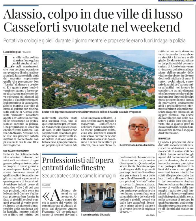 14 APRILE di Daniele Strizioli- Alassio. Lo scorso sabato 11 aprile, nella zona collinare alle spalle di Alassio è avvenuto un duplice, ingente furto in villa, messo a segno con precisione chirurgica tra le località Cavia e Vegliasco. I malviventi sono entrati in azione in tarda mattinata, agendo in un arco temporale ristretto, indicativamente tra le 10 e mezzogiorno. Le vittime sono una famiglia di Torino, in vacanza in Riviera al momento del fatto, e una famiglia di residenti alassini: entrambi erano assenti quando è avvenuto il furto, suggerendo che i colpi siano stati studiati a tavolino e nei minimi dettagli. Secondo le prime ricostruzioni, le modalità d’azione confermerebbero la presenza di più persone, certamente professionisti, dotati di attrezzatura specifica. In uno dei due episodi, infatti, i ladri hanno persino segato le sbarre alle finestre per garantirsi l’accesso.